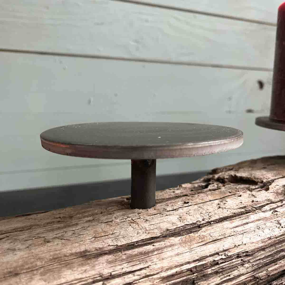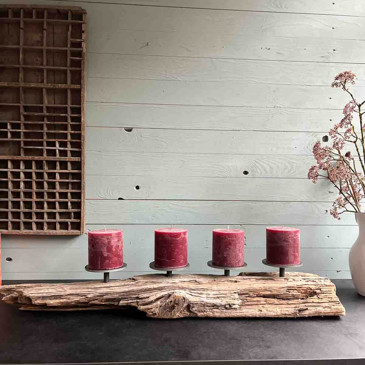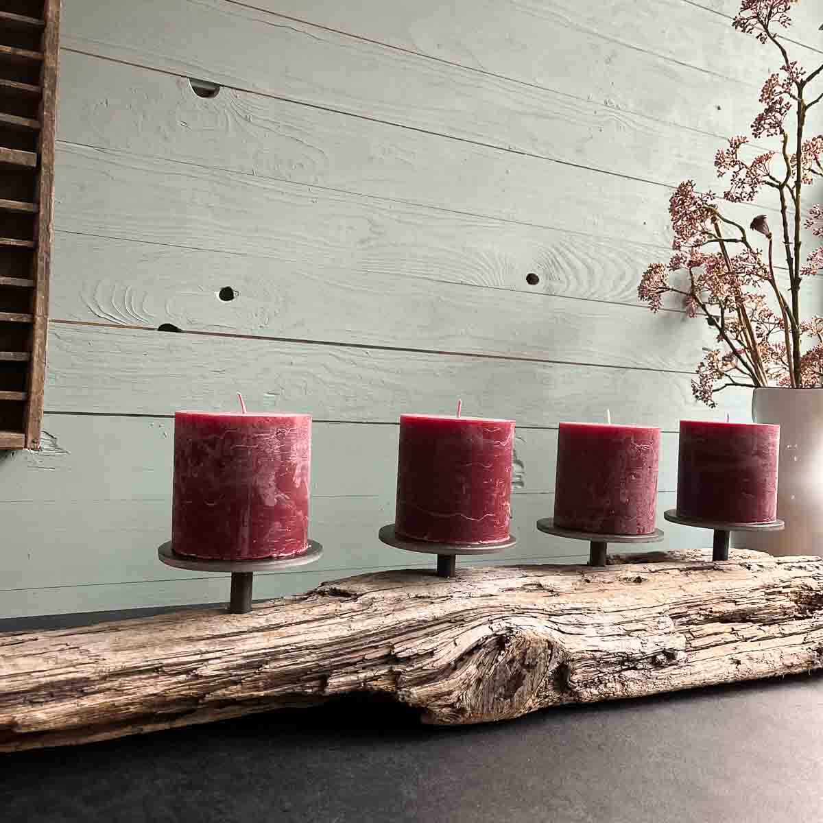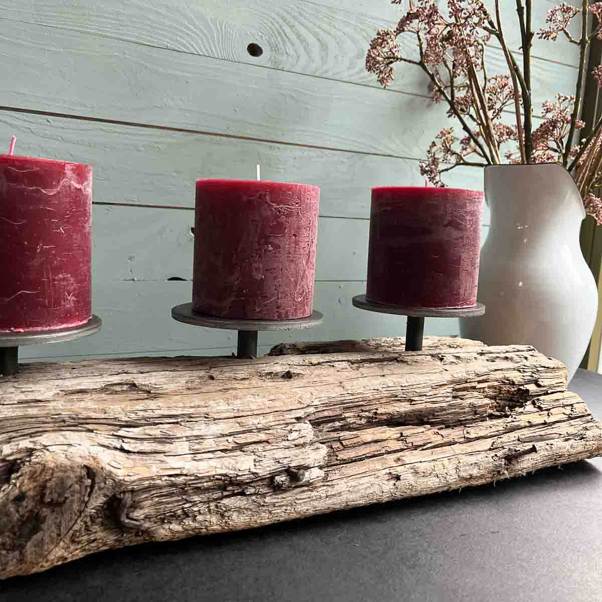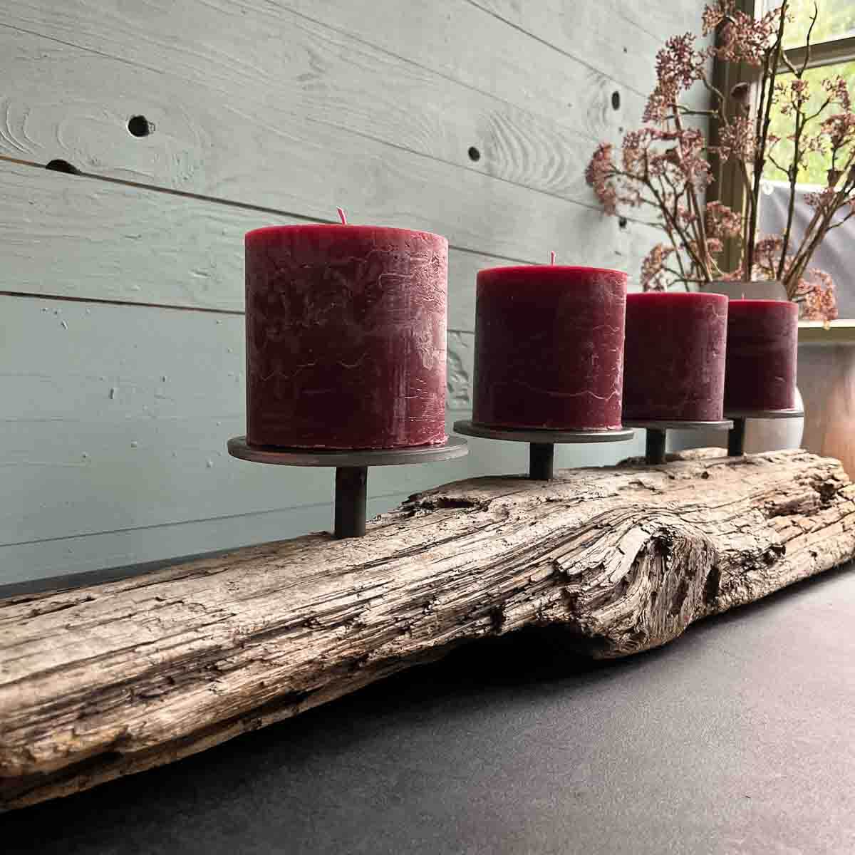 Ich nahm meine selbst hergestellten, massiven Metallkerzenhalter ( Durchmesser 12 cm) und diese fanden nun ihren Platz- schlicht, aber kraftvoll. Sie tragen Stumpenkerzen, deren Licht das Treibholz in ein warmes, goldenes Glühen taucht.